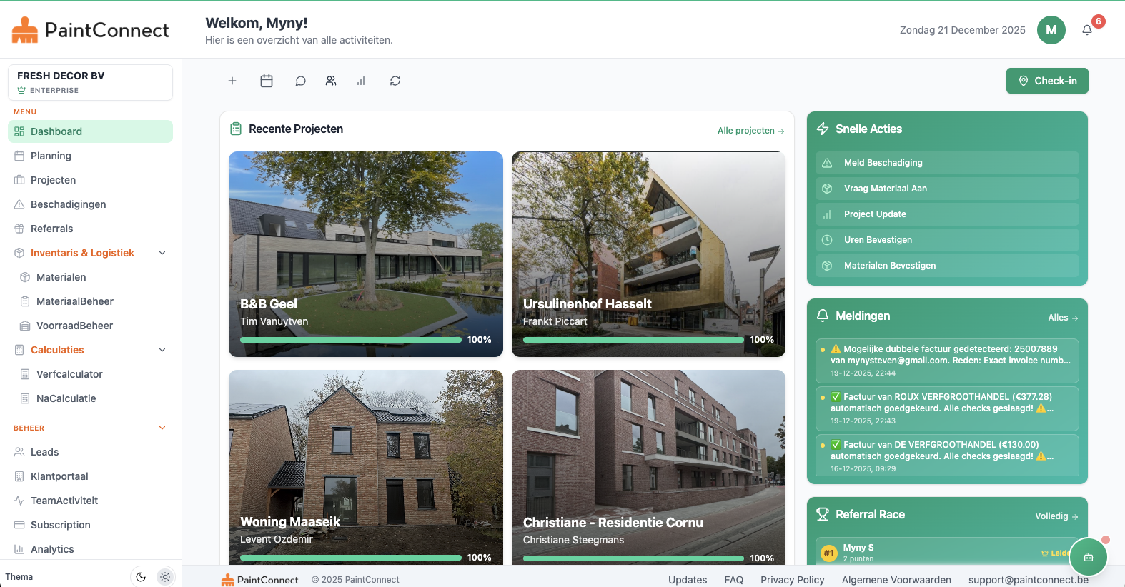 Tijdsregistratie voor schilders werkt door middel van GPS-check-in. Wanneer een schilder aankomt op een projectlocatie, checkt hij in via de PaintConnect app op zijn smartphone. De GPS-locatie wordt automatisch vastgelegd, wat zorgt voor een betrouwbare en objectieve registratie van de werktijden. Bij het uitchecken wordt de eindtijd geregistreerd en wordt automatisch de reistijd tussen projecten berekend.